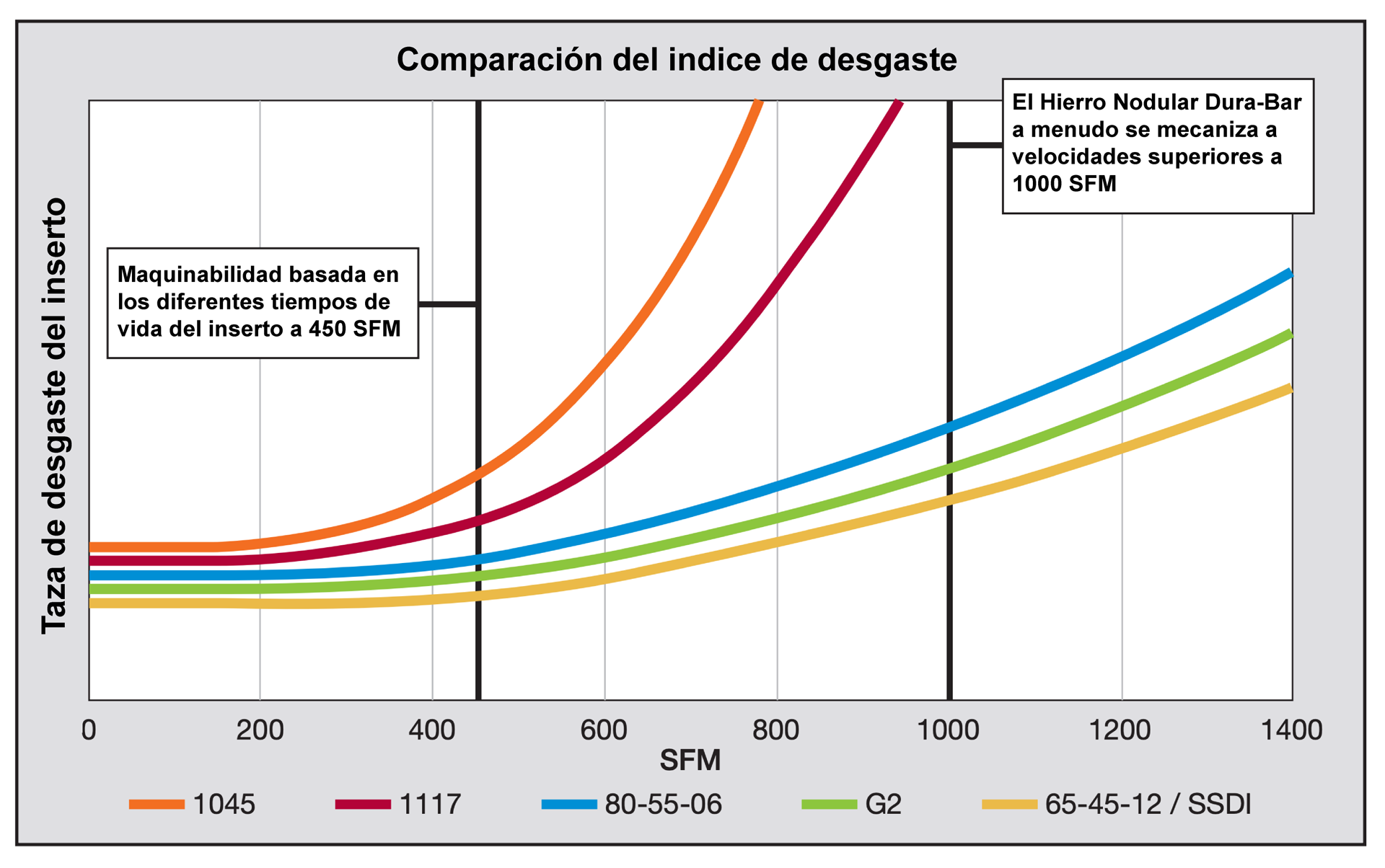 Dura-Bar® es una alternativa de bajo costo en comparación con aceros de bajo y mediano carbono: ● Tiempos de mecanizado más cortos, mejora en la eficiencia productiva. ● Rebabas cortas, sin necesidad de desbarbar. ● Mayor tiempo de vida en insertos y herramientas de corte. ● Vida más larga en la herramienta y mejores acabados superficiales. ● Mejor resistencia al desgaste ● Buen desempeño en aplicaciones de amortiguamiento ● Rebabas consistentes, compactas y libres de plomo.