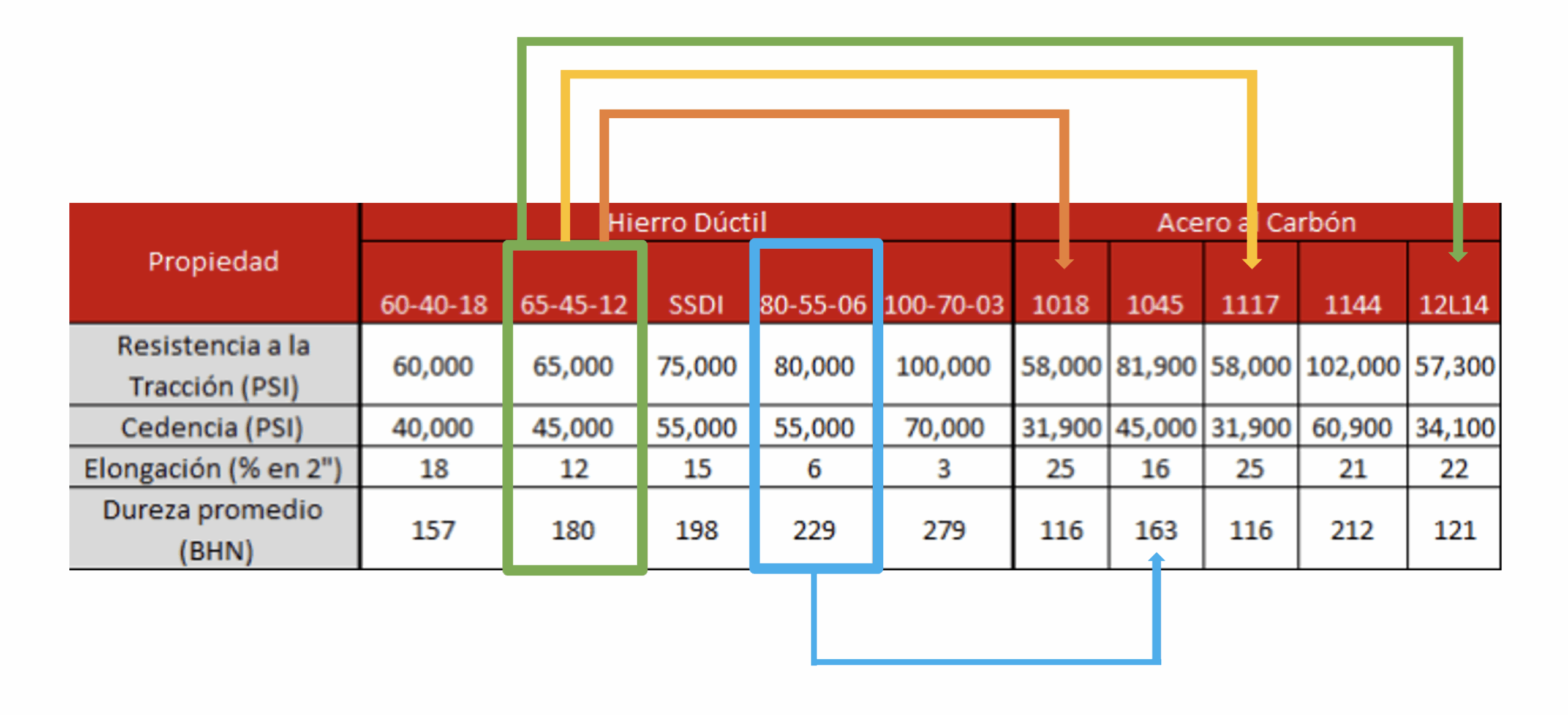 | Hierro Dúctil | 114.5 - 195.75 KSI | |